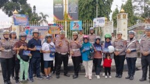 PULUHAN HELM SNI DI BAGIKAN SAAT KAMPANYE KESELAMATAN BERLALU LINTAS DI CFD PEKANBARU